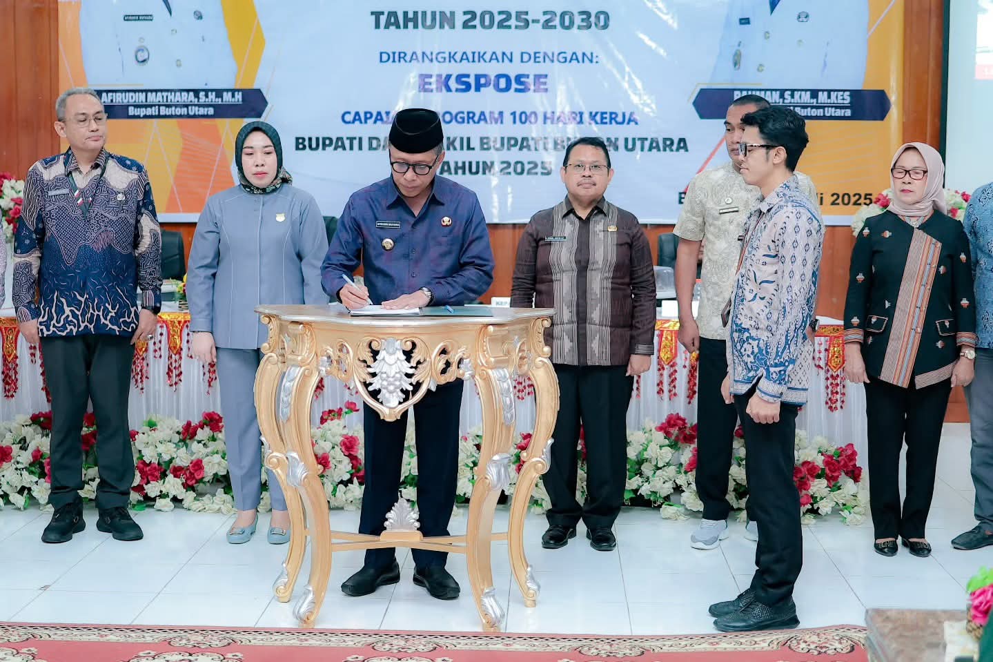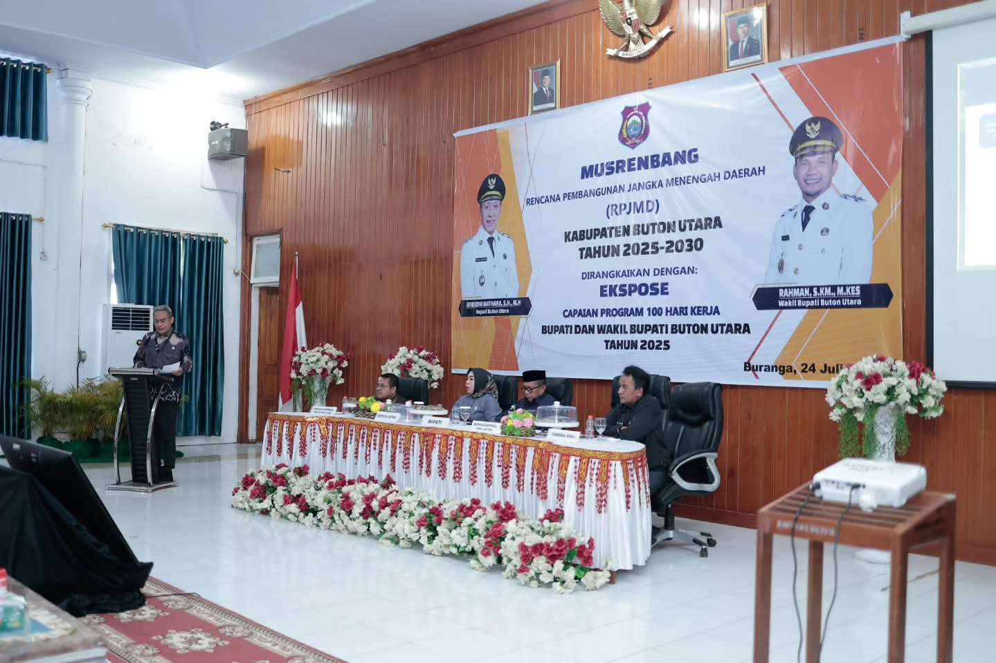 REFERENSISULTRA.COM, Ekpos capaian 100 hari kerja kepemimpinan Bupati dan Wakil Bupati Kabupaten Buton Utara (Butur) Afirudin Mathara – Rahman. Serta dirangkaikan dengan musyawarah Rencana Pembangunan Jangka Menengah Daerah (RPJMD) 2025-2029 di Aula Badan Perencanaan Pembangunan Darah (Bappeda), Kecamatan Kulisusu, Kamis (24/7/2025).