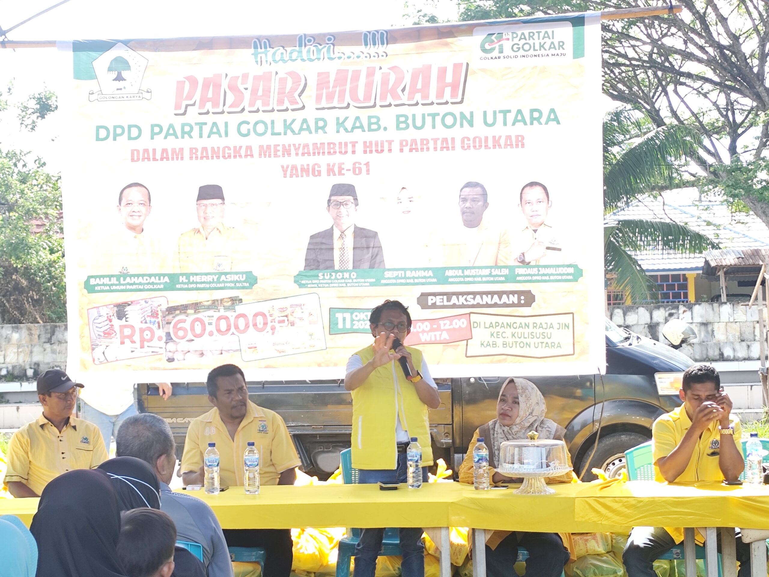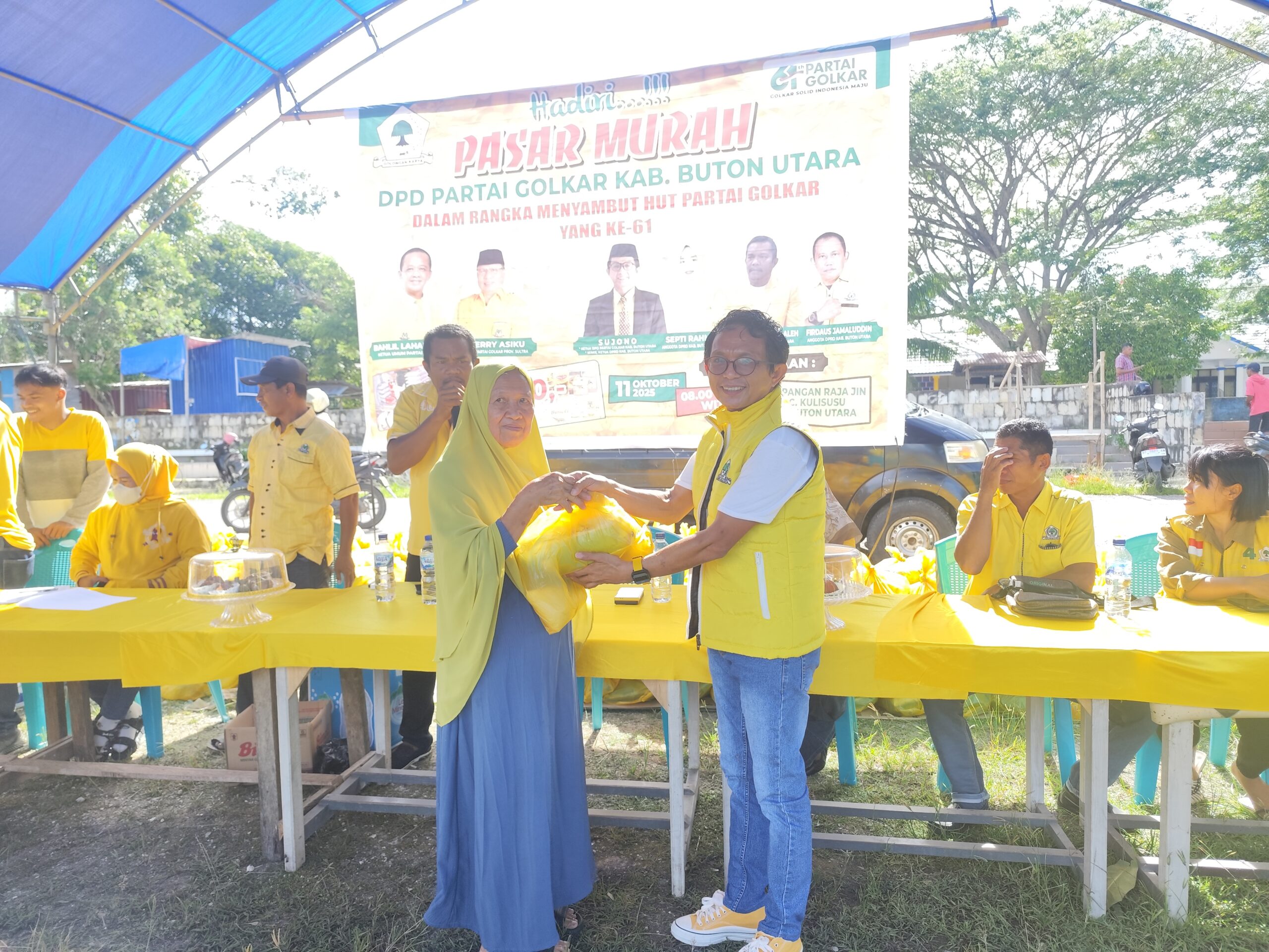 REFERENSISULTRA.COM, Dalam rangka memperingati Hari Ulang Tahun (HUT) Partai Golongan Karya (Golkar) ke 61. Dewan Pimpinan Daerah (DPD) Partai Golkar Kabupaten Buton Utara menggelar pasar murah, di Kecamatan Kulisusu yang berlangsung di lapangan raja jin, Sabtu (11/10/2025).
