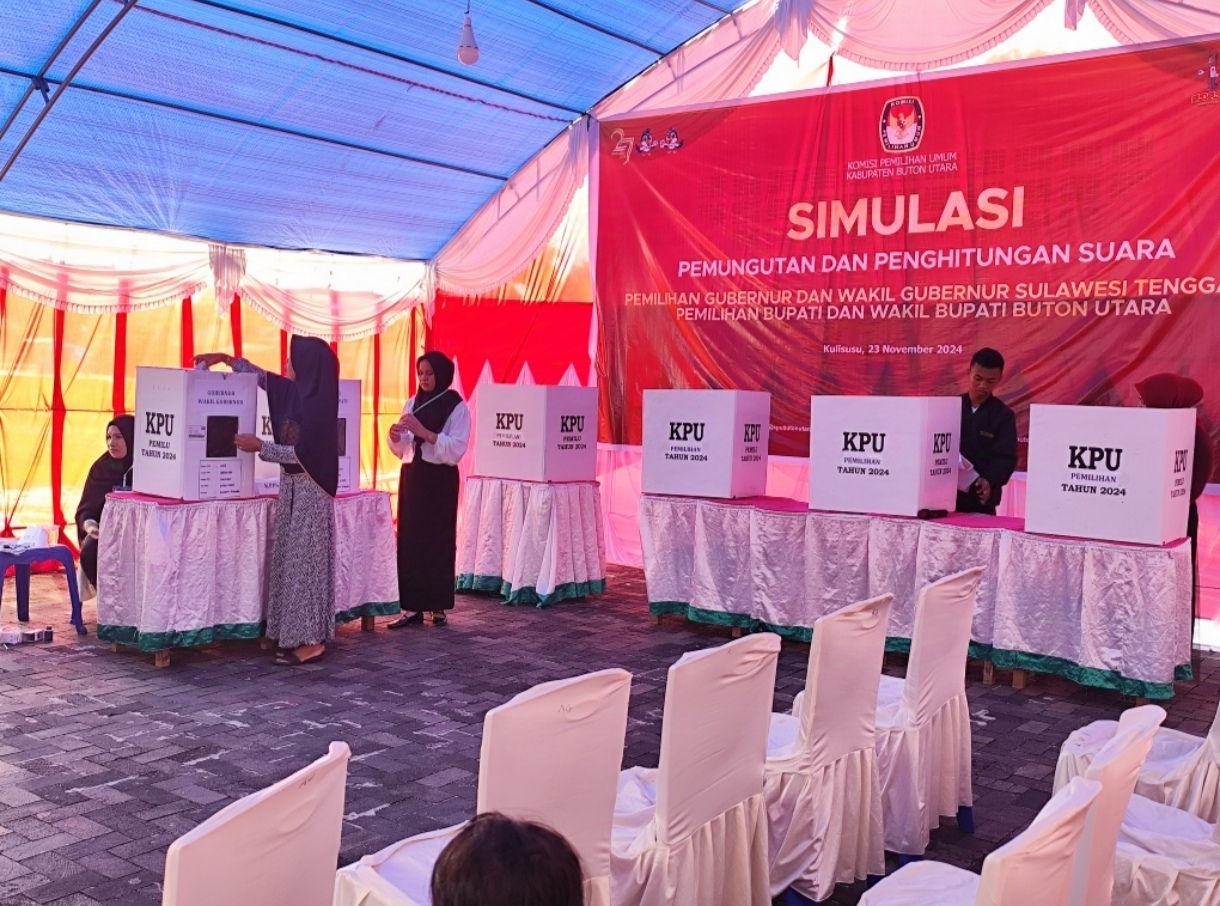 REFERENSISULTRA.COM – Komisi Pemilihan Umum (KPU) Kabupaten Buton Utara (Butur) melaksanakan simulasi pemungutan dan perhitungan suara untuk pemilihan Gubernur dan Wakil Gubernur serta Bupati dan Wakil Bupati pada Pemilihan Kepala Daerah (Pilkada) serentak 2024.