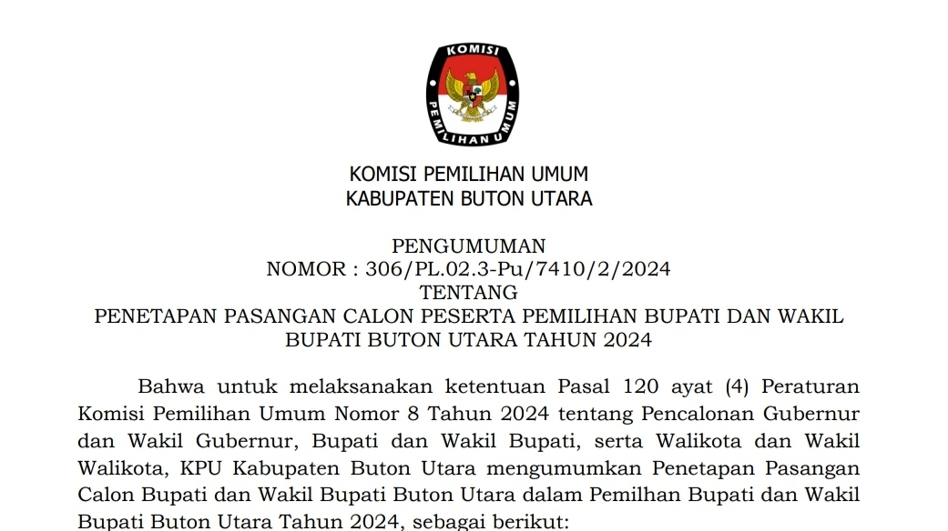 Ketentuan Pasal 120 ayat (4) Peraturan KPU Nomor 8 Tahun 2024 tentang Pencalonan Gubernur dan Wakil Gubernur, Bupati dan Wakil Bupati, serta Walikota dan Wakil Walikota, KPU Butur mengumumkan penetapan pasangan calon Bupati dan Wakil Bupati Buton Utara dalam pemilihan Bupati dan Wakil Bupati Tahun 2024.