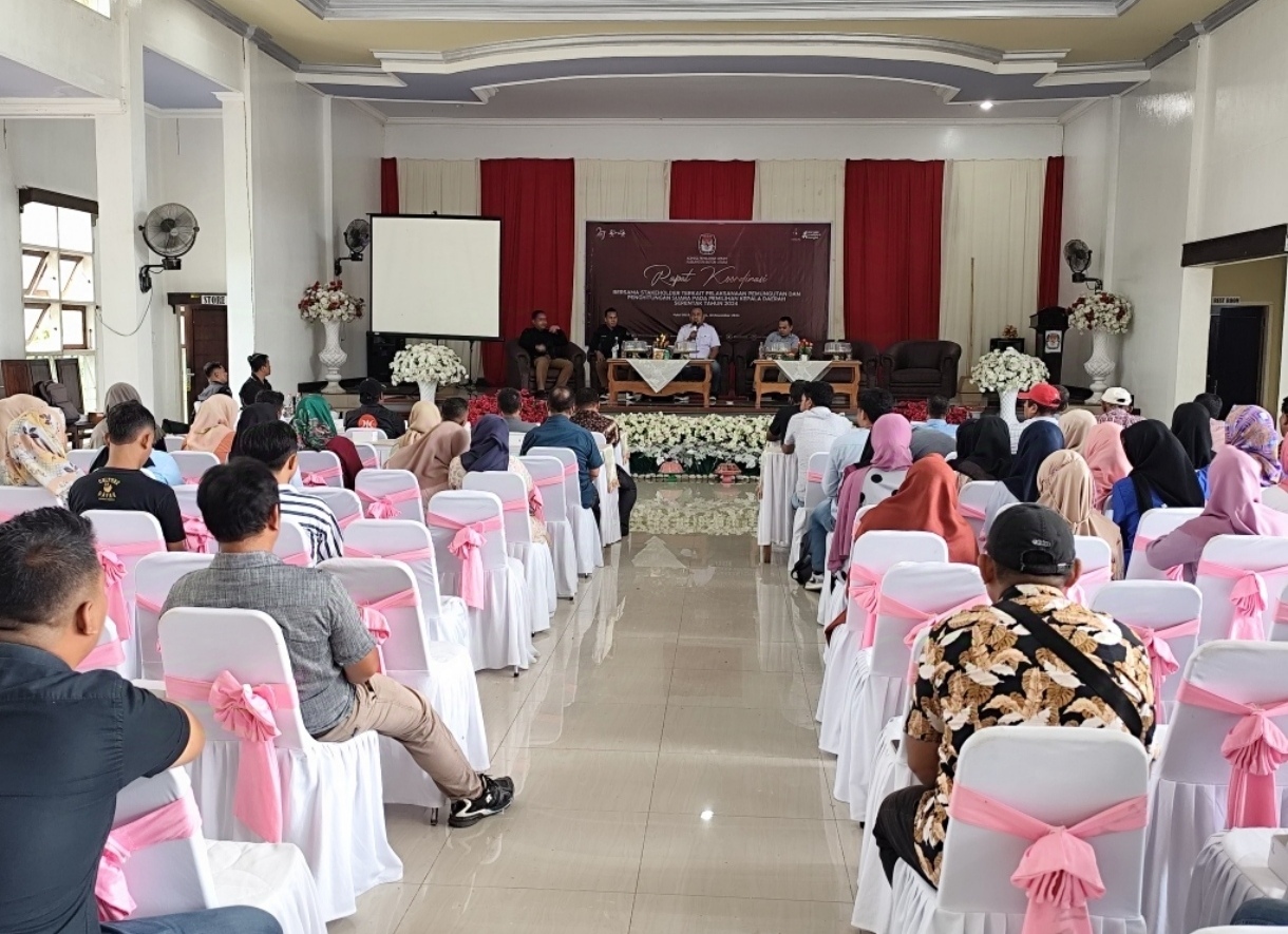 KPU Butur, menggelar Rapat koordinasi (Rakor) pelaksanaan dan perhitungan suara pada pemilihan Gubernur dan Wakil Gubernur Sulawesi tenggara serta Bupati dan Wakil Bupati kepala daerah (Pilkada) serentak Tahun 2024, yang berlangsung di Aula Hotel HB Kecamatan Kulisusu, Rabu (20/11/2024).