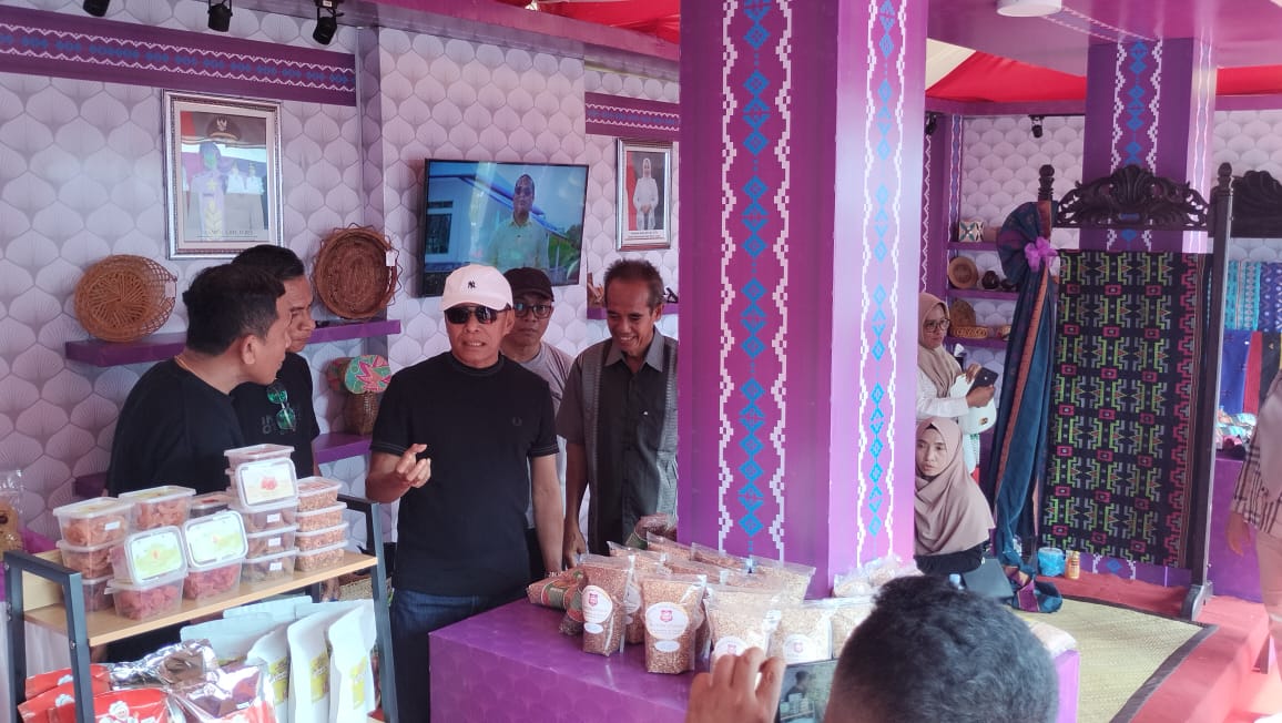 Saat memperhatikan sejumlah prodak yang dipamerkan, Bupati mengapresiasi Panitia Kabupaten Buton Utara atas partisipasinya pada festival Harmoni Sultra.